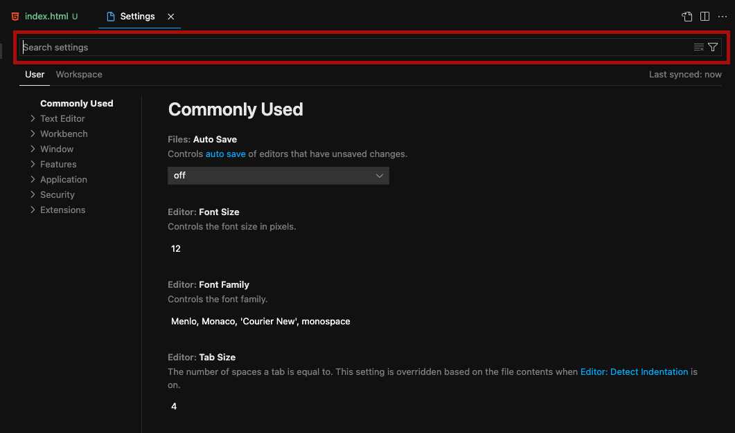 vs code에서 cmd + , 를 눌러 setting 화면에 진입한다.